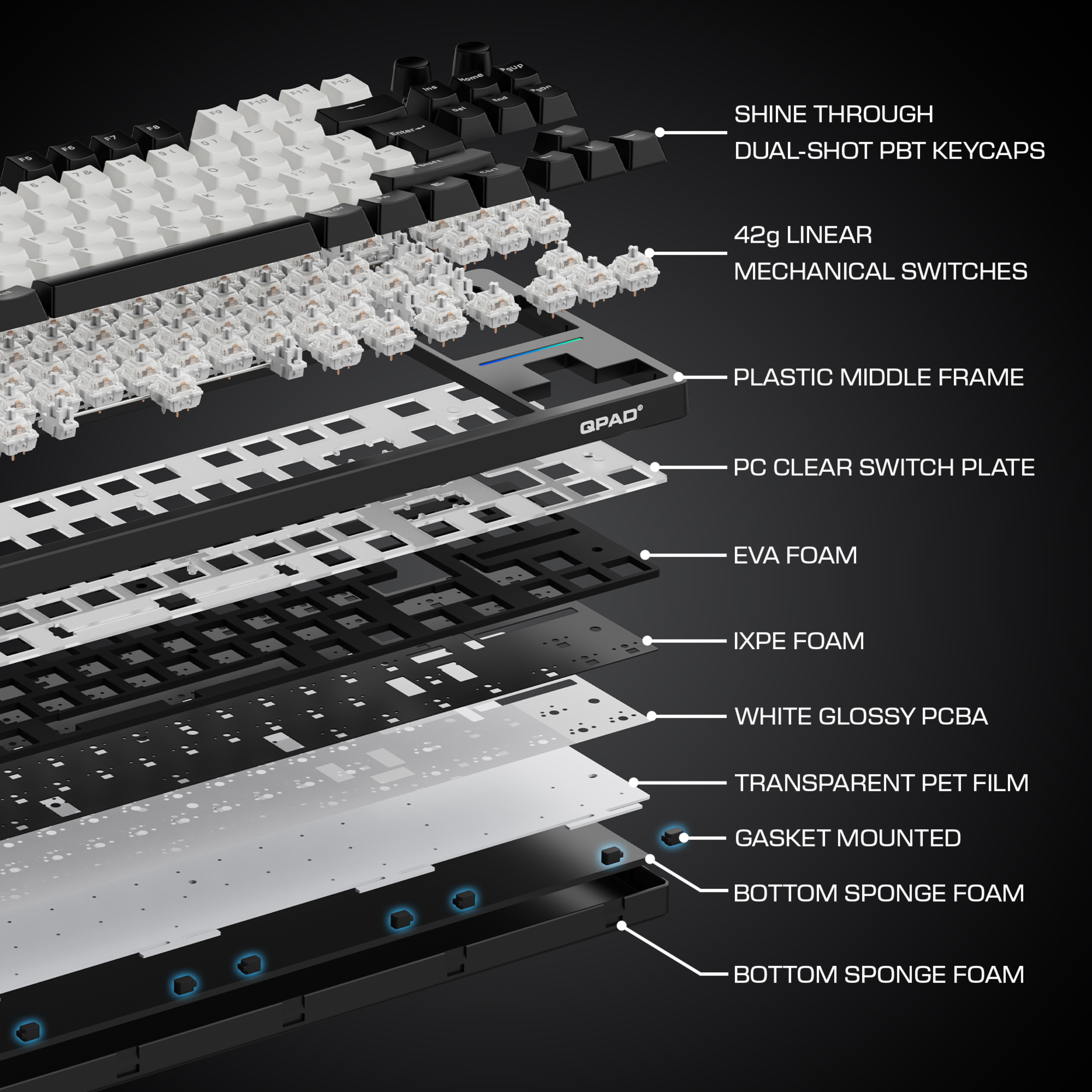 gasket structure – Gasket mount with foam layers for soft, quiet typing.