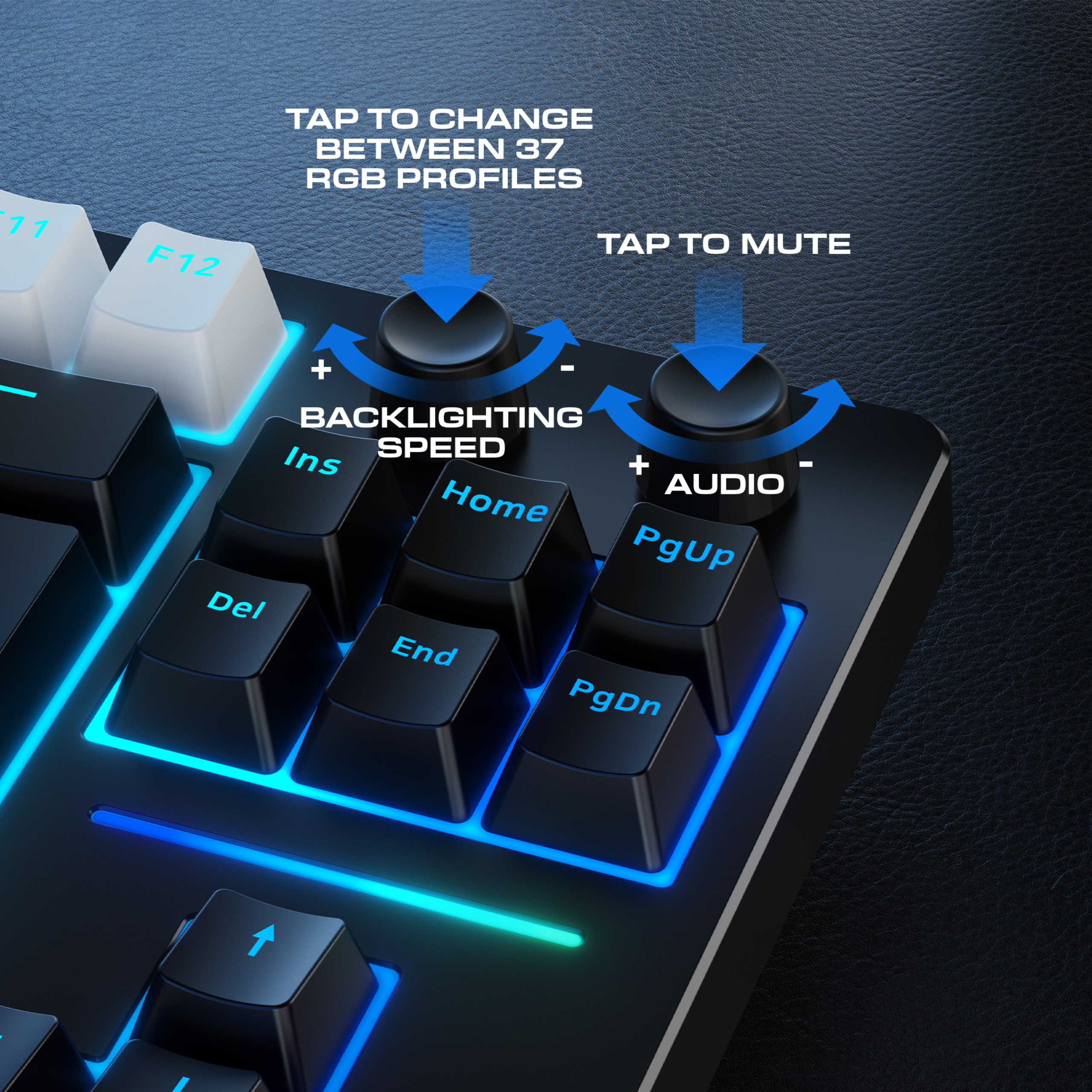 Dual Dials – The two dials are built for fast, intuitive control. The left dial manages your RGB: tap to cycle through up to 37 lighting profiles, and turn to adjust the animation speed. The right dial manages your audio: tap to instantly mute/unmute, and turn to adjust the system volume. With these tactile controls, you stay in command without leaving your game or software.