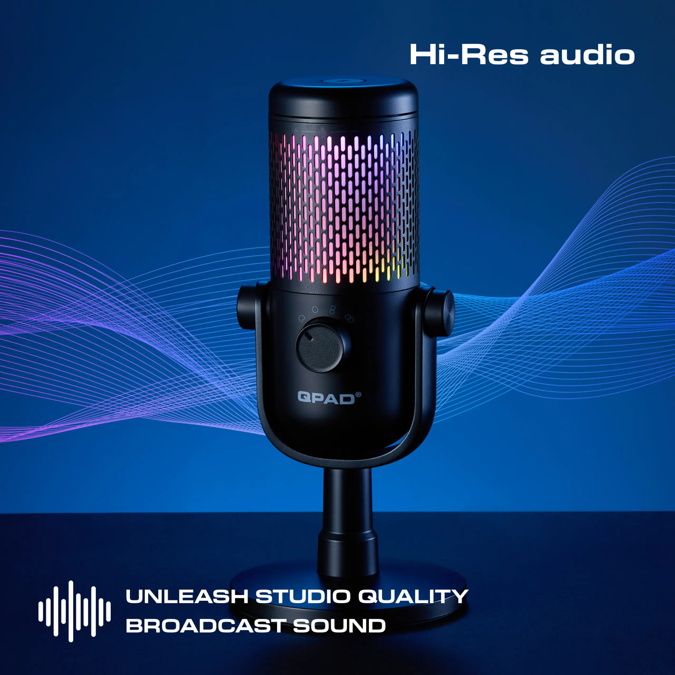 The QPAD Omnibeam Stream Pro microphone is ideal for streaming, podcasting, or content creation. It features a cardioid pickup pattern, support for 24-bit Hi-Res Audio, universal compatibility with popular microphone arms, and user-friendly connectivity options.